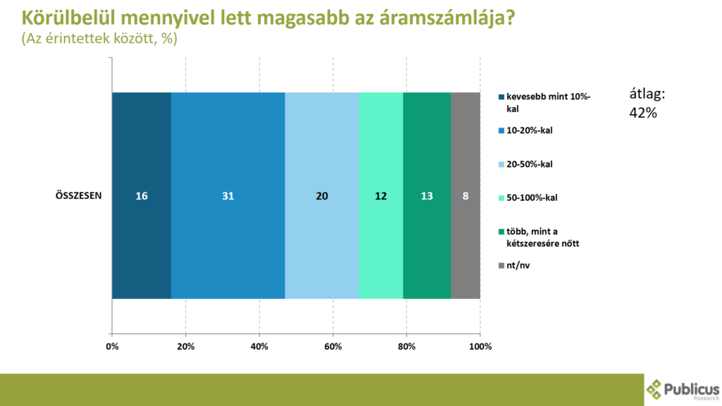 Átlagban 42 százalékkal lett magasabb az áramszámlája a megkérdezetteknek. Közülük közel minden nyolcadiknak (13 százalék) több mint kétszeresével, szintén minden nyolcadiknak (12 százalék) 50-100 százalékkal, minden ötödiknek (20 százalék) 20-50 százalékkal, tízből három (31 százalék) válaszadónak 10-20 százalékkal, a megkérdezettek 16 százalékának pedig kevesebb mint 10 százalékkal lett magasabb az áramszámlája.