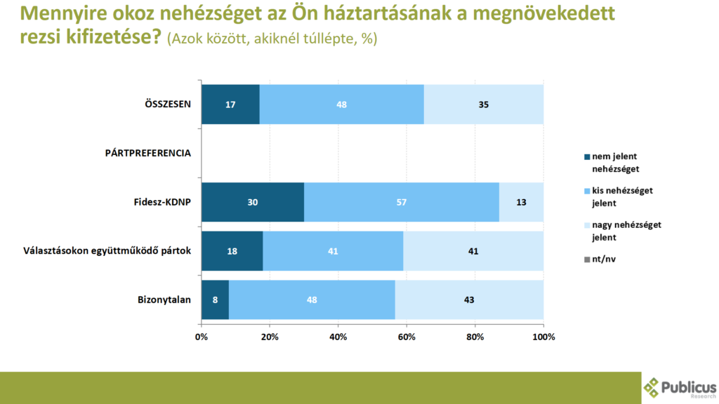 Minden második (48 százalék) válaszadó mondta azt, hogy kis nehézséget fog neki jelenteni a megnövekedett rezsi kifizetése. Ezt közölte a választásokon együttműködő ellenzéki pártok szavazói közül tízből négy (41 százalék), minden második (48 százalék) bizonytalan szavazó, illetve tízből közel hat (57 százalék) bizonytalan szavazó.