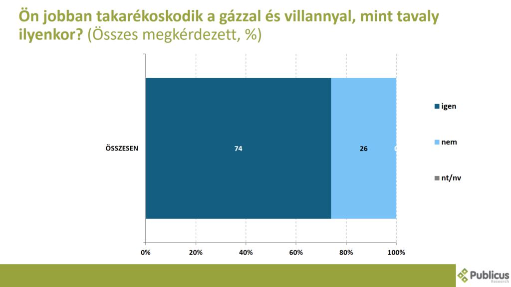 A válaszadók háromnegyede (74 százalék) mondta azt, hogy jobban takarékoskodik a gázzal és villannyal, mint tavaly ilyenkor.