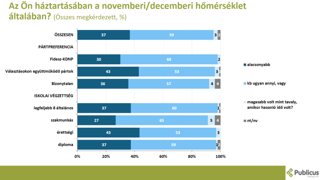 Tízből négy (37 százalék) megkérdezett mondta azt, hogy az ő háztartásában a novemberi/decemberi hőmérséklet általában alacsonyabb volt, mint tavaly ilyenkor. Így nyilatkozott a választásokon együttműködő ellenzéki pártok szavazói közül tízből négy (43 százalék), a bizonytalan szavazók picivel több mint harmada (36 százalék), illetve tízből három (30 százalék) Fidesz szavazó.