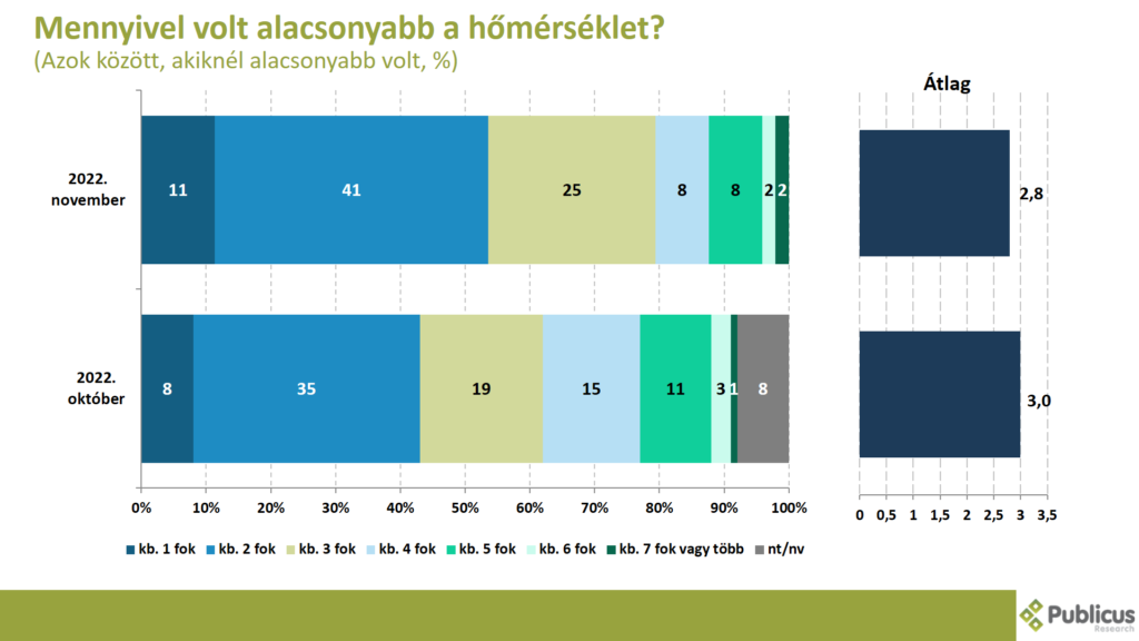 A megkérdezettek háztartásában átlagosan 2,8 fokkal volt alacsonyabb a novemberi/decemberi hőmérséklet, mint tavaly ilyenkor. Ez az érték 0,2 fokkal alacsonyabb, mint a szeptemberi/októberi adatok.