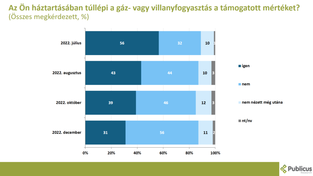 A megkérdezettek 31 százaléka mondta azt, hogy a háztartásában túllépi a gáz- vagy villanyfogyasztás támogatott mértékét. 2022 októberében 39 százalék, 2022 augusztusában 43 százalék, 2022 júliusában pedig még 56 százalék volt ez az arány, azaz hónapról hónapra kevesebben vannak azok, akik többet fogyasztanak a támogatott mértéknél.