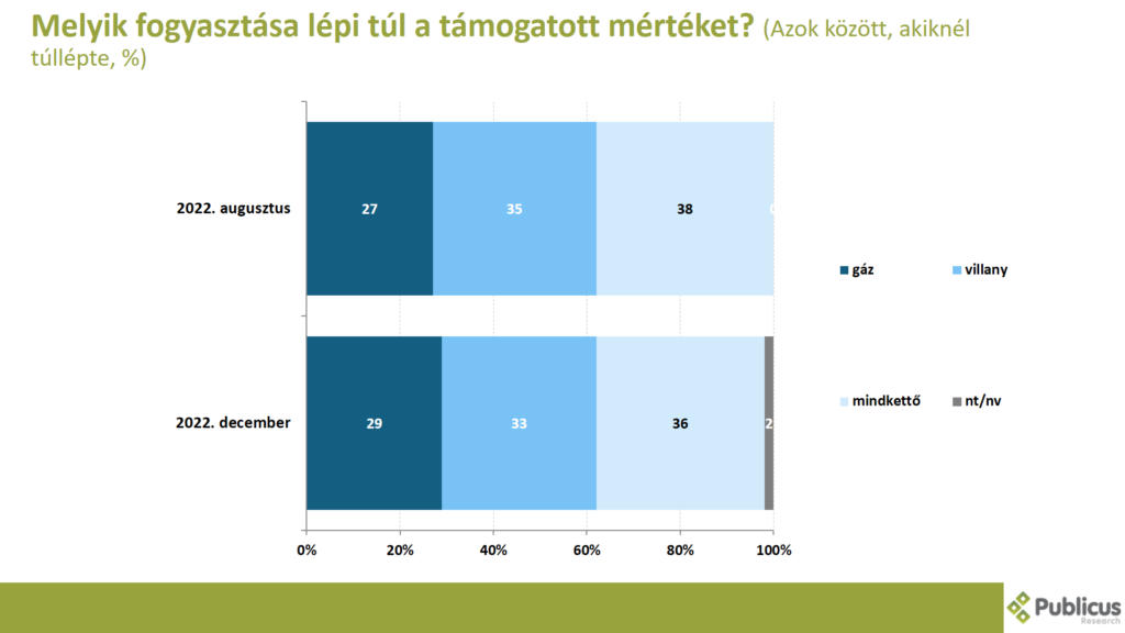 Azok körében, akik túllépik az államilag támogatott mértéket, a válaszadók 29 százaléka a gáz, 33 százaléka a villany, 36 százaléka pedig mindkettő esetében túllépi azt. [2022 augusztusában is hasonló arányok jöttek ki]