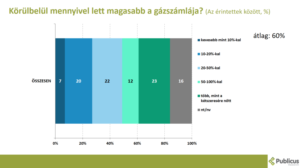 Átlagban 60 százalékkal lett magasabb a gázszámlája a válaszadóknak. Közel negyedüknek (23 százalék) több, mint kétszeresével, minden nyolcadik megkérdezettnek 50-100 százalékkal, minden ötödiknek (22 százalék) 20-50 százalékkal, szintén minden ötödiknek (20 százalék) 10-20 százalékkal, közel minden tizedik (7 százalék) válaszadónak pedig kevesebb mint 10 százalékkal lett magasabb a gázszámlája.
