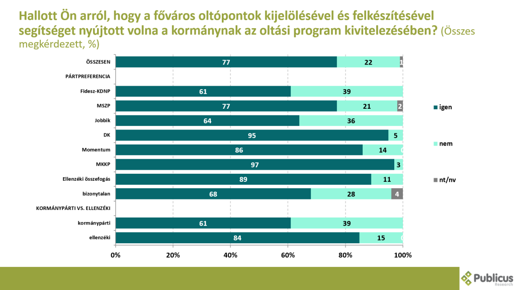 A megkérdezettek döntő többsége hallott róla és egyet is ért a főváros azon kezdeményezésével, hogy oltópontok kijelölésével és felkészítésével segítséget az oltási program kivitelezésében. Míg az ellenzéki szavazók 87, addig a kormánypártiaknak csak 30 százaléka támogatná a kezdeményezést.