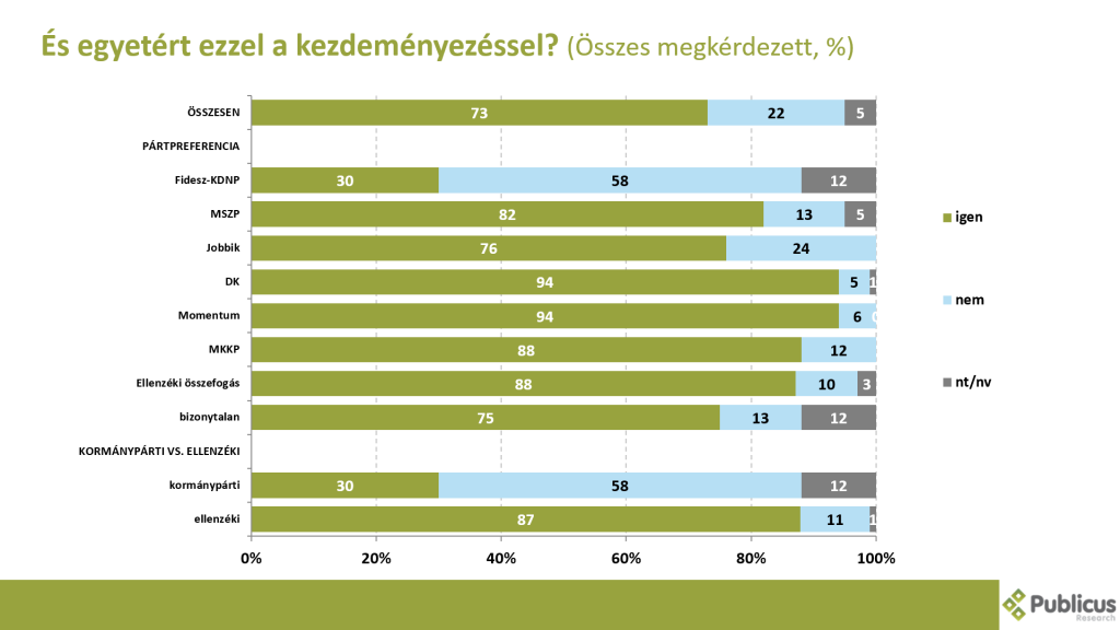 A válaszadók döntő többsége (73 százalék) egyetért a kezdeményezéssel, ám ebben a véleményben erősen meghatározó a pártpreferencia. Míg az ellenzéki szavazók 87, addig a kormánypártiaknak csak 30 százaléka támogatná a kezdeményezést. A bizonytalan választ adók aránya is jelentősen magasabb a kormánypárti szavazók körében – 12 százalék az ellenzéki 1 százalékhoz képest. Legnagyobb arányban a DK és Momentum szavazók (94-94 százalék) értenek egyet a főváros felajánlásával, míg legkevésbé a Fidesz-KDNP szavazók.