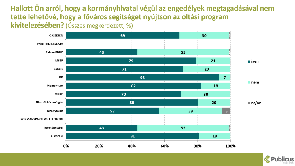 Tízből hét megkérdezett hallott arról, hogy a kormányhivatal az engedélyek megtagadásával nem tette lehetővé, hogy a főváros segítséget nyújtson az oltási program kivitelezésében. Ez az arány jóval alacsonyabb a kormánypárti (43 százalék), mint az ellenzéki szavazók körében (81 százalék). Az eseményről a megkérdezett DK szavazók hallottak a legnagyobb arányban (93 százalék), míg a Fidesz-KDNP szavazóknak kevesebb mint fele értesült (43 százalék).