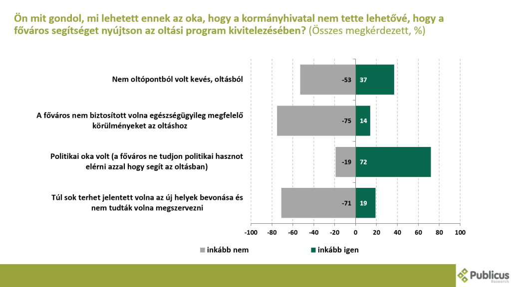 A válaszadók közel háromnegyede (72 százalék) gondolja úgy, hogy politikai oka volt a kormányhivatal döntésének, vagyis ezzel akarták megakadályozni, hogy a főváros politikai hasznot szerezzen azzal, hogy segít az oltásban. 37 százalék gondolja úgy, hogy nem oltópontból volt kevés, hanem oltásból, 19 százalék, hogy túl sok terhet jelentett volna az új helyek bevonása és nem tudták volna megszervezni, illetve 14 százalék, hogy a főváros nem biztosított volna egészségügyileg megfelelő körülményeket az oltáshoz.
