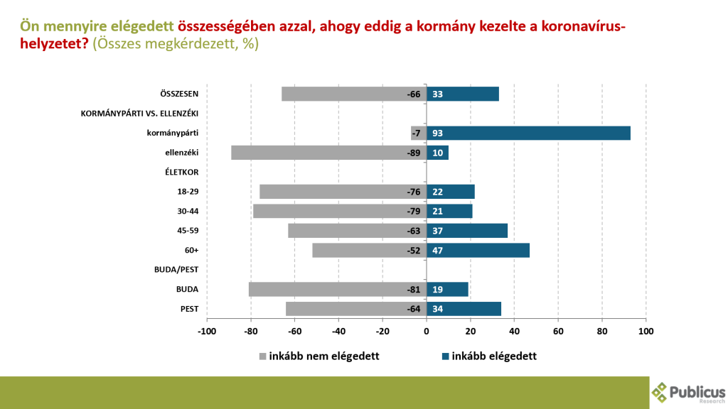 A megkérdezett budapestiek kétharmada nem elégedett azzal, ahogy a kormány eddig kezelte a járványhelyzetet. A kérdésben a pártpreferencia döntő erővel bír – a megkérdezett kormánypártiak 93 százaléka, míg az ellenzékiek csupán 10 százaléka elégedett a kormány teljesítményével. Emellett korosztályonként és mutatkoznak eltérések – a fiatalok inkább elégedetlenek, míg a 60 felettieknél közelít egymáshoz az elégedettek (47 százalék) és az elégedetlenek aránya (52 százalék). A Duna két oldalán élőknek is némiképp eltérő a benyomása – míg a pestieknek 34, addig a budaiknak csak 19 százaléka elégedett a kormány járványkezelésével.