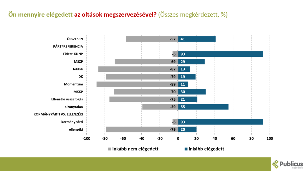 Az oltások megszervezésének kérdése megosztó: 41 százalék inkább elégedett, míg 57 százalék inkább elégedetlen a szervezéssel. A Fidesz-KDNP szavazók döntő többsége elégedett (93 százalék), míg a Momentum és a Jobbik szavazók között a legmagasabb az elégedetlenek aránya (89 és 87 százalék), valamint az összes ellenzéki párt szavazói inkább elégedetlennek bizonyultak.