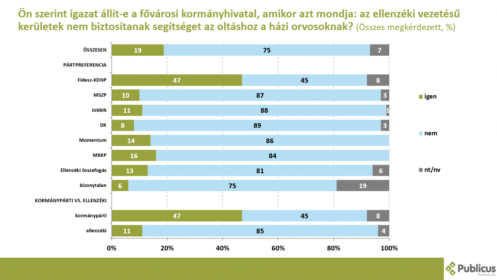 A válaszadók háromnegyede nem gondolja, hogy igazat állít a kormányhivatal, amikor azt mondja, hogy az ellenzéki vezetésű kerületek nem biztosítanak segítséget az oltáshoz a háziorvosoknak. A kérdés még a kormánypárti szavazók körében is megosztó – 47 százalék szerint igazat mond a kormányhivatal, 45 százalék szerint pedig nem. Az ellenzéki szavazók 85 százaléka gondolja, hogy nem állítanak igazat, és ez az arány minden párt támogatói, valamint a bizonytalan szavazók körében is magas (legalább 75 százalék).