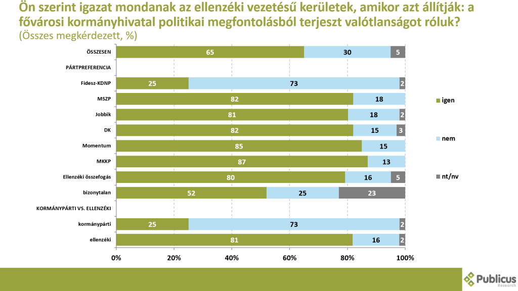 A megkérdezett budapestiek közel kétharmada gondolja, hogy az ellenzéki vezetésű kerületek igazat mondanak, amikor azt állítják, hogy a fővárosi kormányhivatal politikai megfontolásból terjeszt valótlanságot róluk. Míg a kormánypártiaknak csak 25, addig az ellenzéki szavazók 81 százaléka gondolja, hogy igazat mondanak az ellenzéki kerületek.