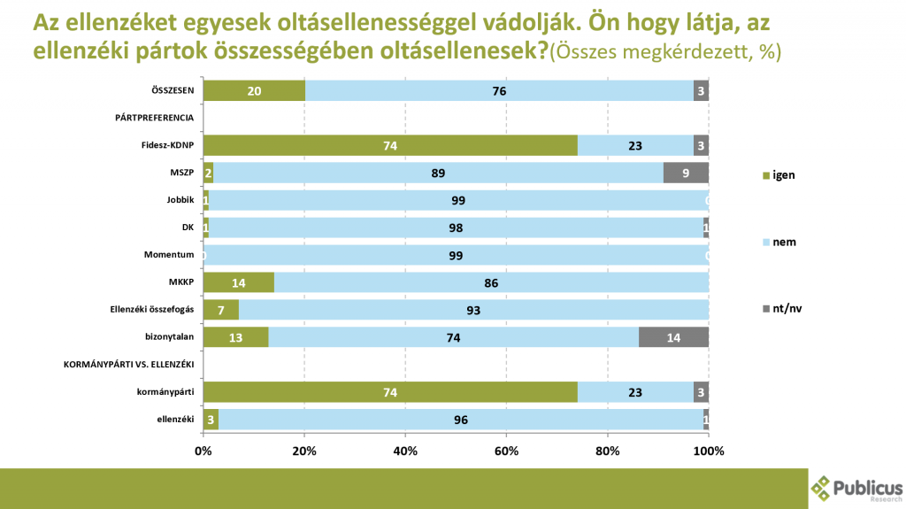 A válaszadók háromnegyede nem látja úgy, hogy az ellenzék oltásellenes lenne. A kérdésben viszont pártpreferencia szerint rendkívül megosztottak a megkérdezett budapestiek – a kormánypárti szavazók 74, míg az ellenzékiek csupán 3 százaléka gondolja úgy, hogy az ellenzék oltásellenes. Érdekes módon az MKKP szavazók jelentősen nagyobb aránya vallja az ellenzéki pártokat oltásellenesnek (14 százalék, míg a többi párt szavazói esetében ez az arány 0 és 2 százalék között mozog).