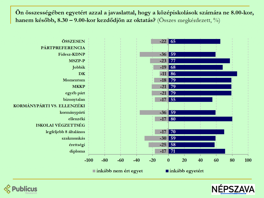 A válaszadók kétharmada összességében támogathatónak tartja, hogy a középiskolások számára később kezdődjön az oktatás. Tízből nyolc ellenzéki szavazó, illetve a kormánypárti szavazók közül tízből hat egyetért a javaslattal.