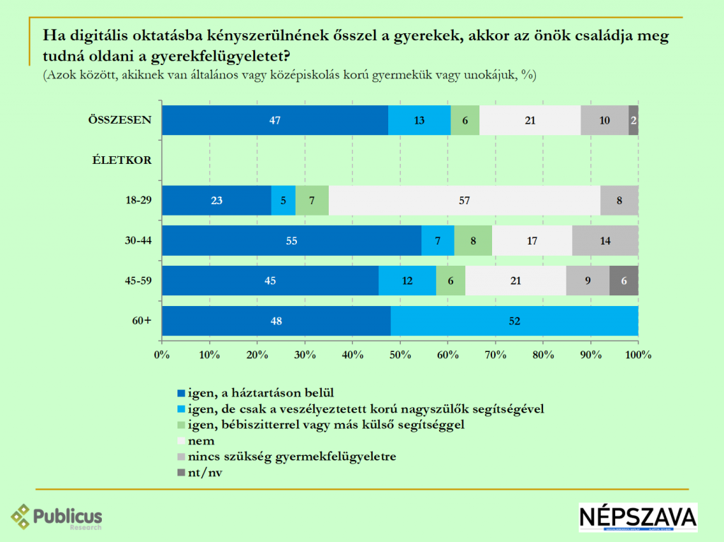 A 30-44 közöttiek 70 százaléka, a 45-59 közöttiek 63 százaléka, a 60 évnél idősebbeknek meg a 100 százaléka mondta azt, hogy valamilyen módon, de képesek lennének biztosítani a gyermekfelügyeletet, ha digitális oktatásba kényszerülnének a gyerekek ősszel.