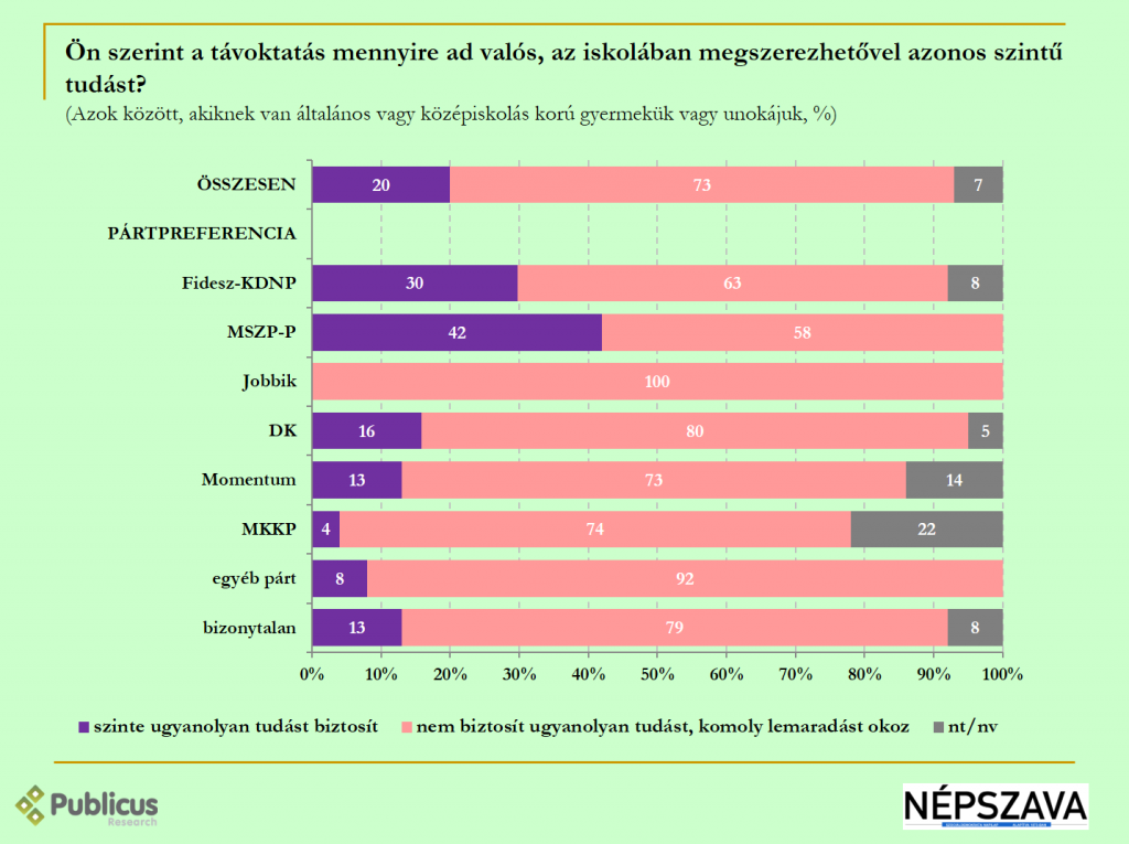 Tízből négy (42 százalék) MSZP-P, és tízből három (30 százalék) Fidesz szavazó szerint szinte ugyanolyan megszerezhető tudást biztosít az iskolai oktatás és a távoktatás. Tízből tíz (100 százalék) Jobbik, illetve tízből nyolc (80 százalék) DK szavazó szerint a távoktatás nem biztosít ugyanolyan tudást, ezért az komoly lemaradást okoz.