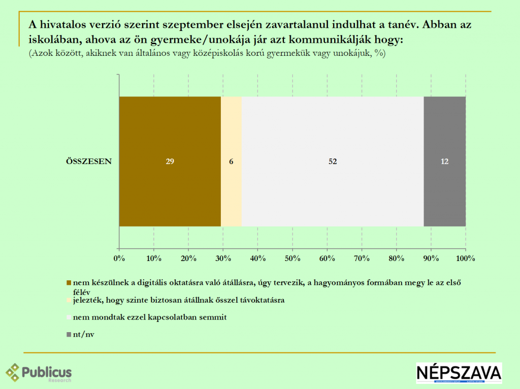 A tervek szerint szeptember elsején zavartalanul indulhat a tanév: tízből három (29 százalék) megkérdezett mondta azt, hogy vagy a gyermeke, vagy az unokája iskolájában azt kommunikálják, hogy nem készülnek a digitális oktatásra való átállásra, s úgy tervezik, a hagyományos formában megy le az első félév. A válaszadók hat százaléka mondta azt, hogy jelezték feléjük, hogy szinte biztosan át fognak majd állni ősszel a távoktatásra.