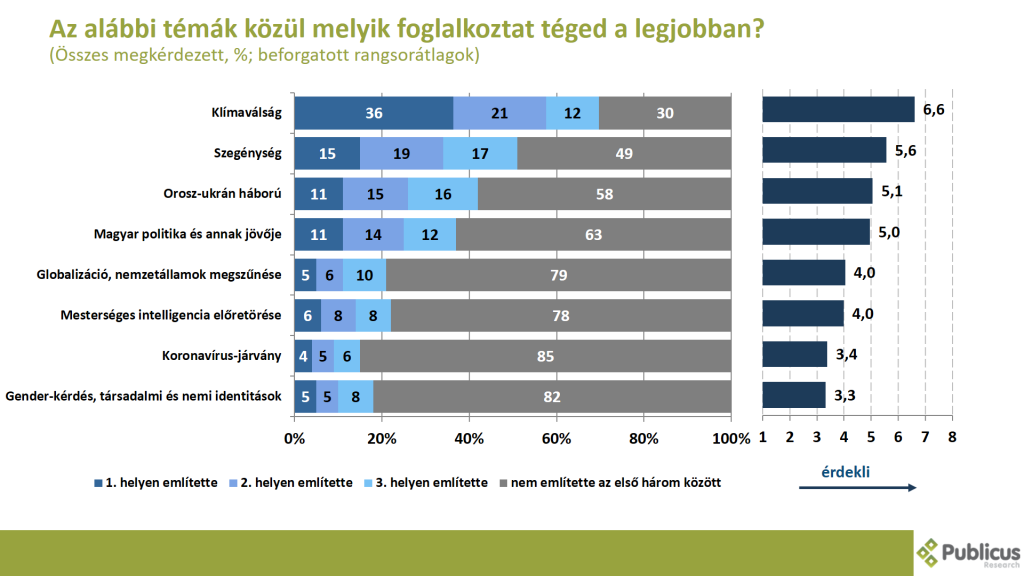 A válaszadó fiatalok 36 százaléka számára jelenleg a klímaváltozás a legfontosabb, 21 százalékuk számára pedig a második legfontosabb kérdés, amelyet az olyan kríziseknél is súlyosabb problémának látnak, mint az ukrajnai háború vagy a szegénység.