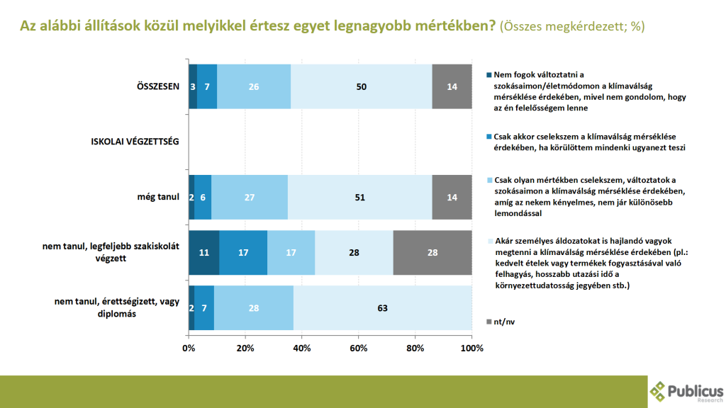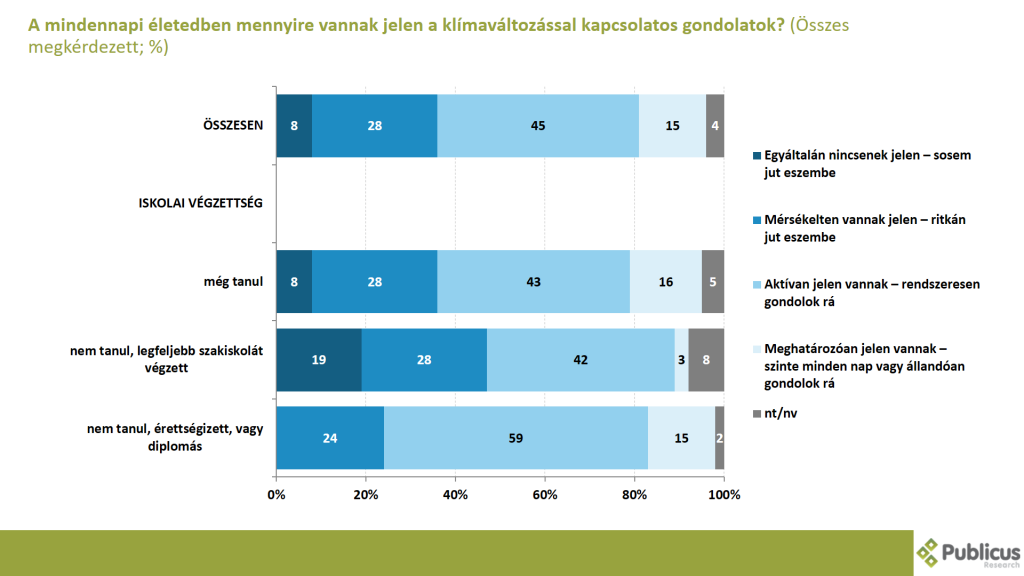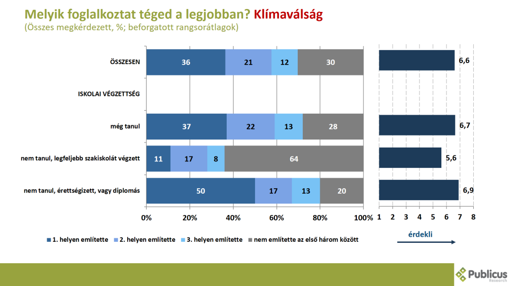 A felmérés szerint a klímaváltozás a képzettebb fiatalokat érdekli a leginkább (50 százalékuk első helyen említette ezt a problémát), a nem tanuló, legfeljebb szakiskolát végzett fiatalokat pedig a legkevésbé (nekik csupán 11 százalékuk tartja ezt a legfontosabb problémának).