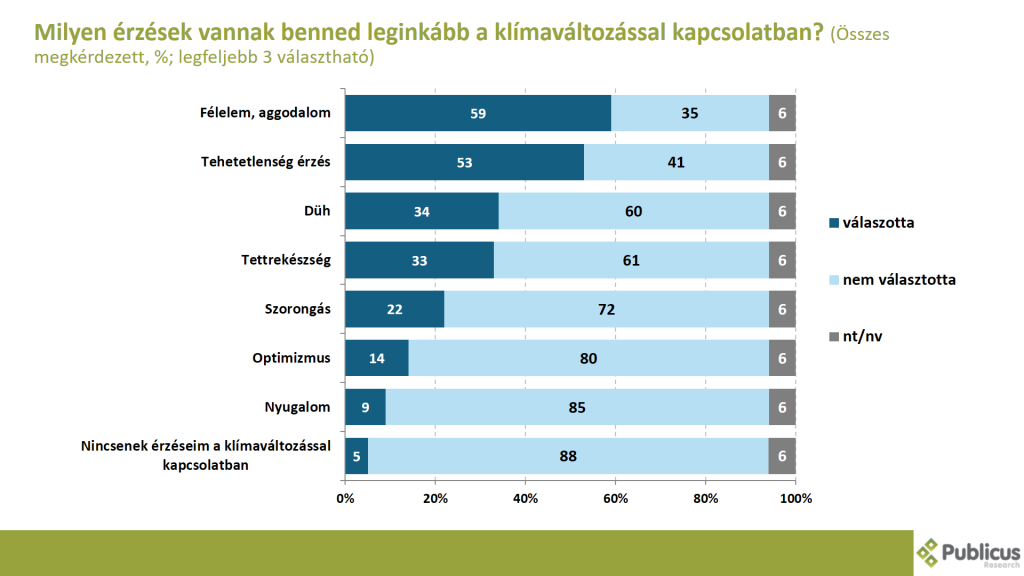 Az UNICEF Magyarország kutatásából kiderül, hogy a hazai fiatalok csaknem 60 százaléka félelmet és aggodalmat, harmaduk pedig kimondottan dühöt él át a klímaválsággal kapcsolatban, tehetetlenséget 53 százalék, nyugalmat viszont mindössze 9 százalék érez.