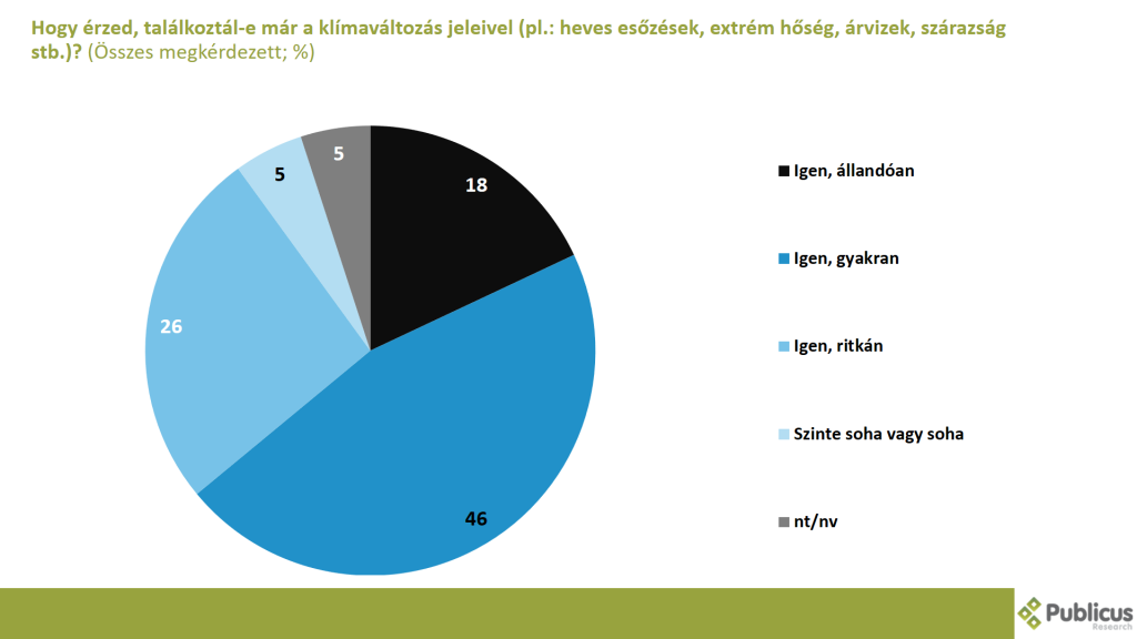 A megkérdezettek messze túlnyomó többsége, 90 százaléka úgy érzi, hogy már ma, a személyes életében is találkozik a klímaváltozás hatásaival. 66 százalék szerint ez kimondottan gyakran fordul elő, 18 százalék pedig állandóan érzi a klímaváltozást a saját bőrén.