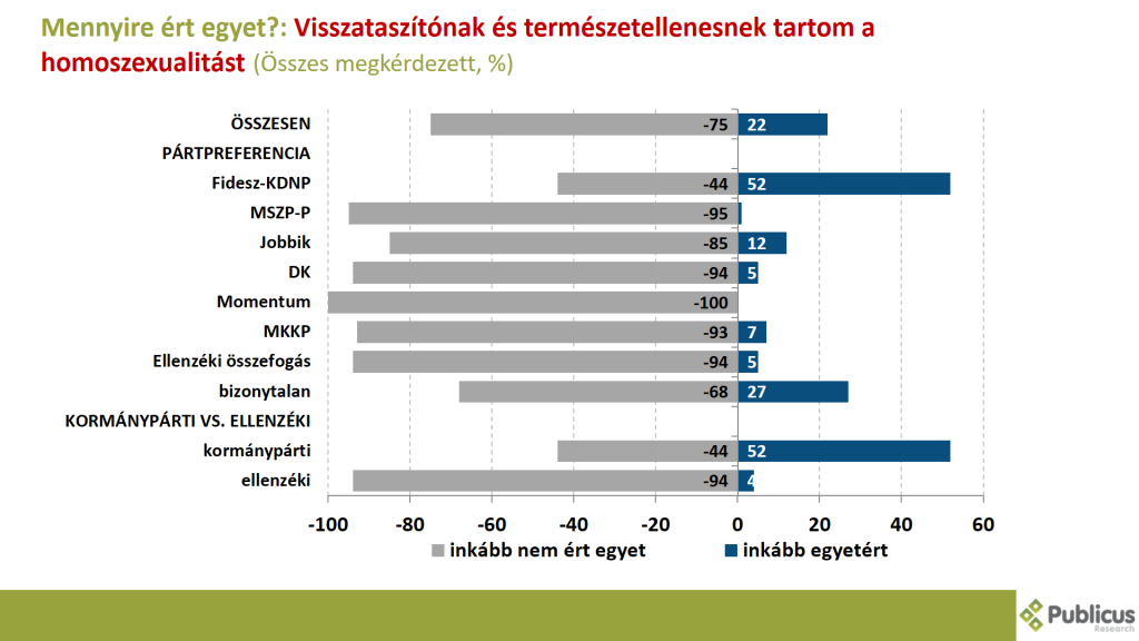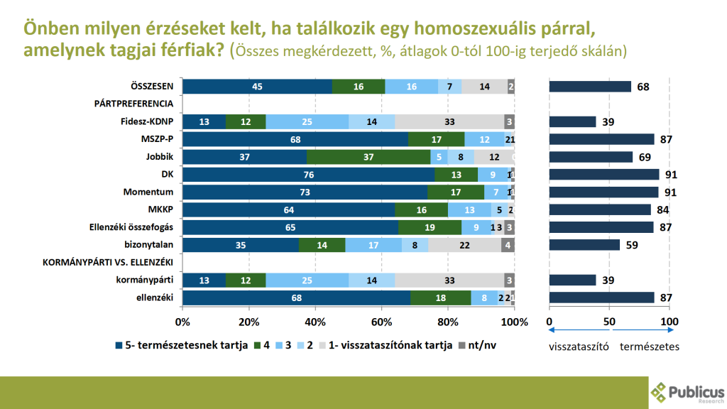 Minden hetedik (14 százalék) válaszadó visszataszítónak tartja azt, ha találkozik egy homoszexuális párral, amelynek a tagjai férfiak. Ezt mondta a Fidesz szavazók harmada (33 százalék), a bizonytalan szavazók ötöde (22 százazék), illetve az ellenzéki szavazók 2 százaléka.