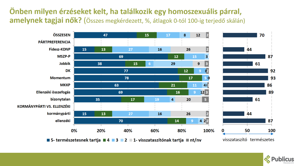 A megkérdezettek közel fele (47 százalék) természetesnek tartja, ha találkozik egy homoszexuális párral, amelynek tagjai nők. Ezt mondta tízből hét (70 százalék) ellenzéki szavazó, a bizonytalan szavazók harmada (35 százalék), továbbá közel minden hetedik (15 százalék) Fidesz szavazó.