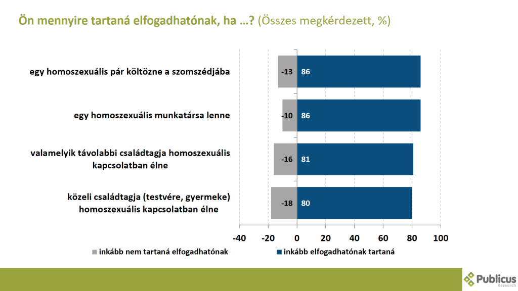 Tízből közel kilenc (86 százalék) megkérdezett tartaná inkább elfogadhatónak, ha egy homoszexuális pár költözne a szomszédjába, vagy egy homoszexuális munkatársa lenne.