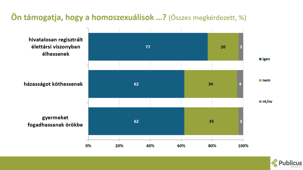 A megkérdezettek háromnegyede (77 százalék) támogatja, hogy a homoszexuálisok hivatalosan regisztrált élettársi viszonyban élhessenek.