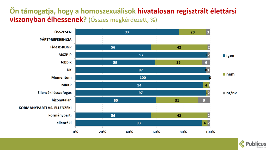 Tízből négy (42 százalék) Fidesz szavazó nem támogatja, hogy a homoszexuálisok hivatalosan regisztrált élettársi viszonyban élhessenek. Így gondolja a Jobbik szavazók harmada (35 százalék), továbbá tízből három (31 százalék) bizonytalan szavazó is.