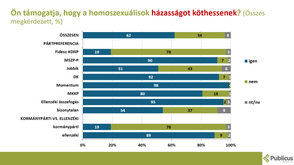 Tízből nyolc (78 százalék) Fidesz szavazó nem támogatja, hogy a homoszexuálisok házasságot köthessenek. Ezt mondta tízből négy (43 százalék) Jobbik szavazó, továbbá a bizonytalan szavazók némileg több mint harmada (37 százalék).
