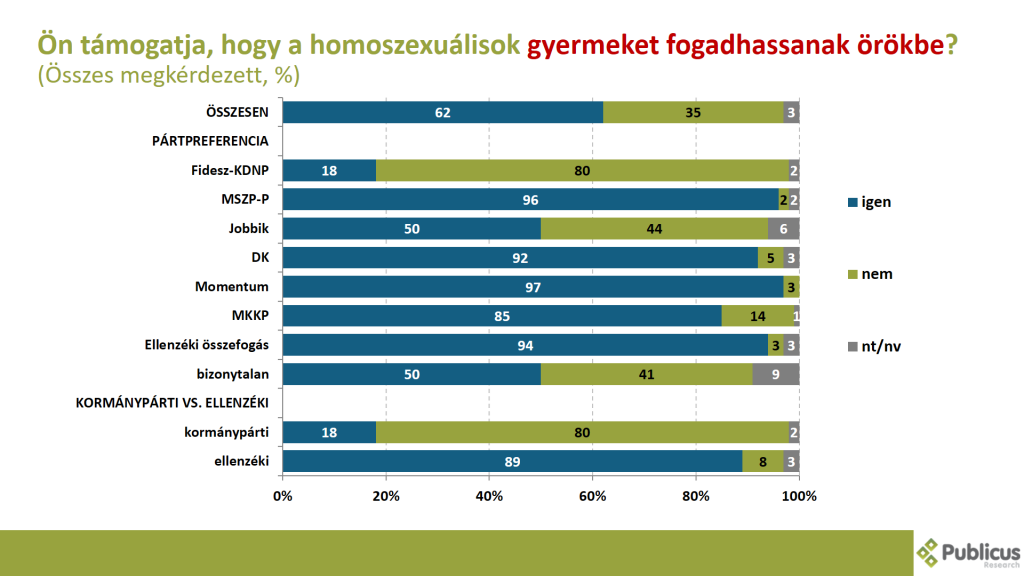 Tízből nyolc (80 százalék) Fidesz szavazó nem támogatja, hogy a homoszexuálisok gyermeket fogadhassanak örökbe. Így gondolja tízből négy (44 százalék) Jobbik, illetve tízből szintén négy (41 százalék) bizonytalan szavazó is.
