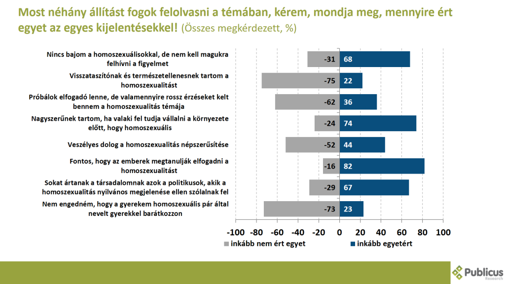 A válaszadók kétharmada (67 százalék) inkább egyetért azzal az állítással, hogy sokat ártanak a társadalomnak azok a politikusok, akik a homoszexualitás nyilvános megjelenése ellen szólalnak fel.