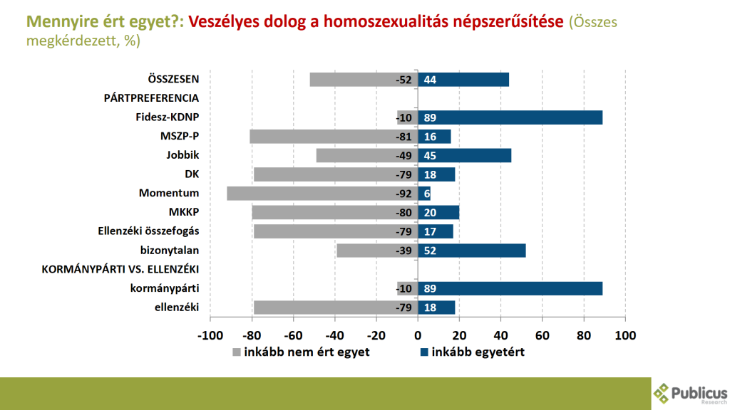 Tízből kilenc (89 százalék) Fidesz szavazó inkább egyetért azzal, hogy veszélyes dolog a homoszexualitás népszerűsítése. Így látja a bizonytalan szavazók és a Jobbik szavazók közel fele is (52 és 45 százalék)