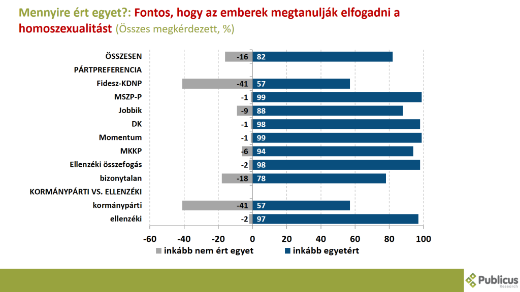 Tízből négy (41 százalék) Fidesz szavazó inkább nem ért egyet azzal az állítással, hogy fontos, hogy az emberek megtanulják elfogadni a homoszexualitást. Így gondolja minden ötödik (18 százalék) bizonytalan szavazó, továbbá minden tizedik (9 százalék) Jobbik szavazó.