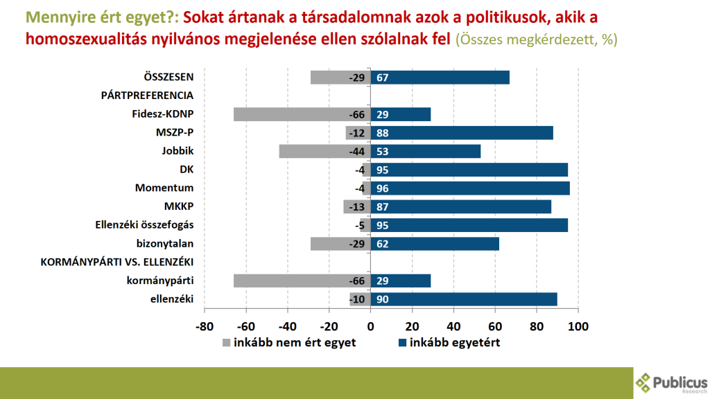 A Fidesz szavazók kétharmada (66 százalék) inkább nem ért egyet azzal az állítással, hogy sokat ártanak a társadalomnak azok a politikusok, akik a homoszexualitás nyilvános megjelenése ellen szólalnak fel. Ezt látja tízből négy (44 százalék) Jobbik szavazó, továbbá tízből három (29 százalék) bizonytalan szavazó is.