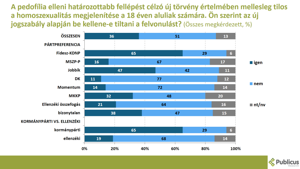 A válaszadók harmada inkább egyetért azzal, hogy be kellene tiltani a Pride-felvonulást. Így nyilatkozott a Fidesz szavazók háromegyede, továbbá tízből négy bizonytalan szavazó és szintén tízből négy Jobbik szavazó.
