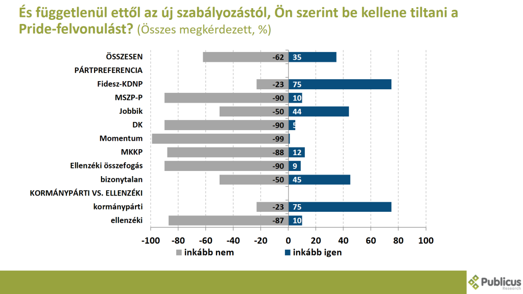 Függetlenül ettől az új szabályozástól, a válaszadók harmada (35 százalék) inkább egyetért azzal, hogy be kellene tiltani a Pride-felvonulást. Így nyilatkozott a Fidesz szavazók háromegyede (75 százalék), továbbá tízből négy bizonytalan szavazó és szintén tízből négy Jobbik szavazó. (45-44 százalék).