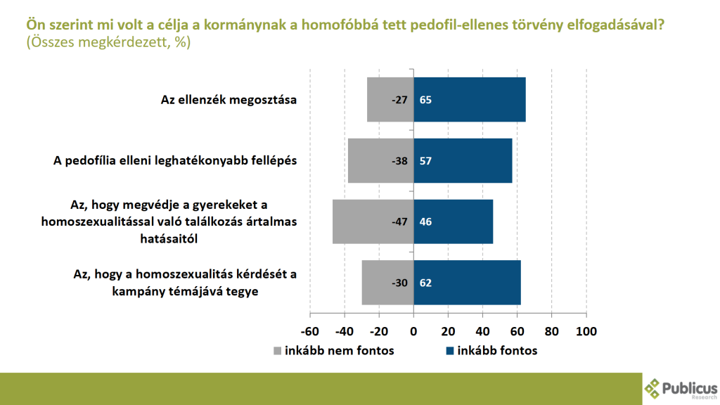 A megkérdezettek kétharmada (65 százalék) szerint inkább fontos célja volt a kormánynak a homofóbbá tett pedofil-ellenes törvény elfogadásával, hogy megossza az ellenzéket.