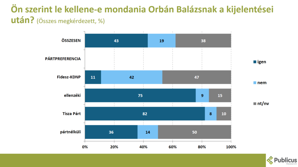 A megkérdezettek 43 százaléka szerint le kellene mondania Orbán Balázsnak a kijelentései után. Így gondolja a Tisza Párt szavazóinak a 82 százaléka, az ellenzéki szavazók 75 százaléka, a pártnélküliek 36 százaléka, illetve a Fidesz szavazók 11 százaléka. Tízből közel négy válaszadó nem tudott, vagy nem akart válaszolni a kérdésre. (A Fidesz szavazóknál 47 százalék ez az arány)
