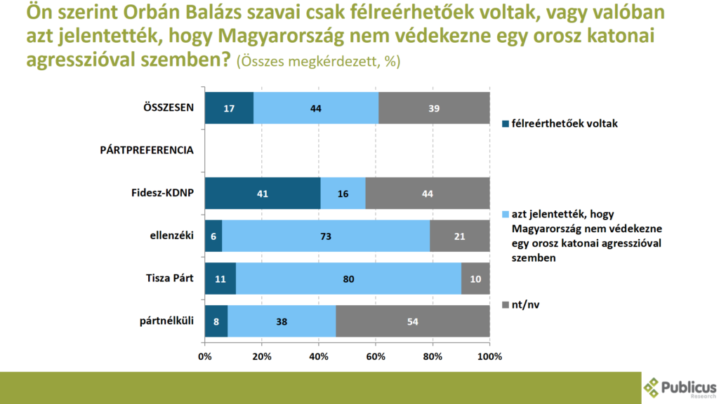 A válaszadók 44 százaléka szerint Orbán Balázs szavai valóban azt jelentették, hogy a Magyarország nem védekezne egy orosz katonai agresszióval szemben. Így gondolja a Tisza Párt szavazóinak a 80 százaléka, az ellenzéki szavazók 73 százaléka, a pártnélküliek 38 százaléka, illetve a Fidesz szavazók 16 százaléka.