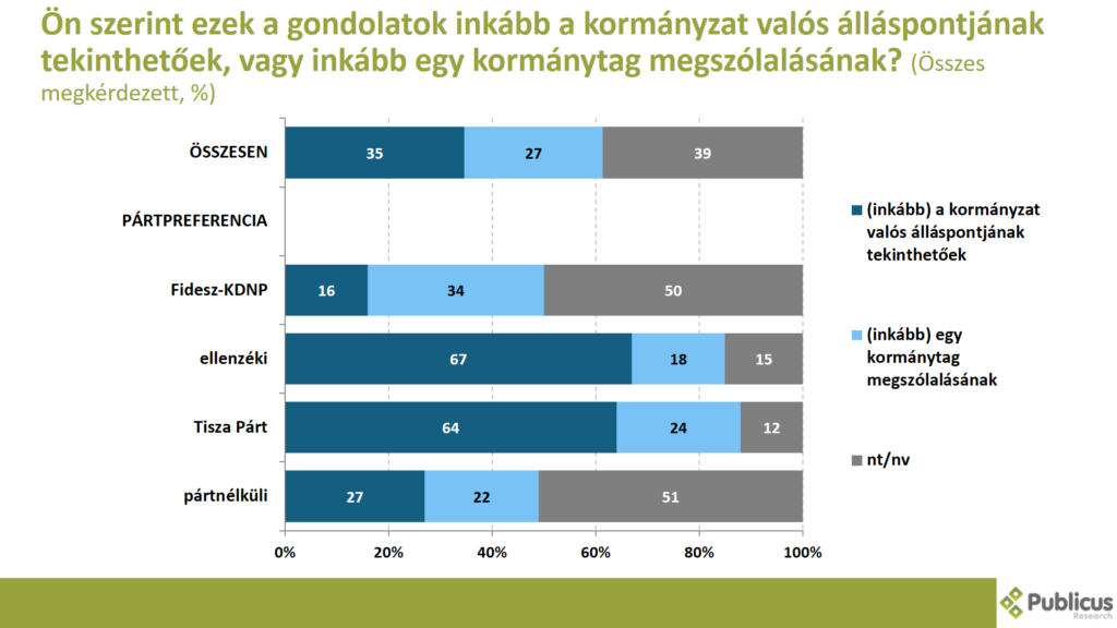A megkérdezettek harmada (35 százalék) szerint ezek a gondolatok inkább a kormányzat valós álláspontjának tekinthetőek. Így látja az ellenzéki szavazók, illetve a Tisza párti szavazók közel kétharmada (67 és 64 százalék), a pártnélküliek negyede (27 százalék), illetve a Fidesz szavazók 16 százaléka.