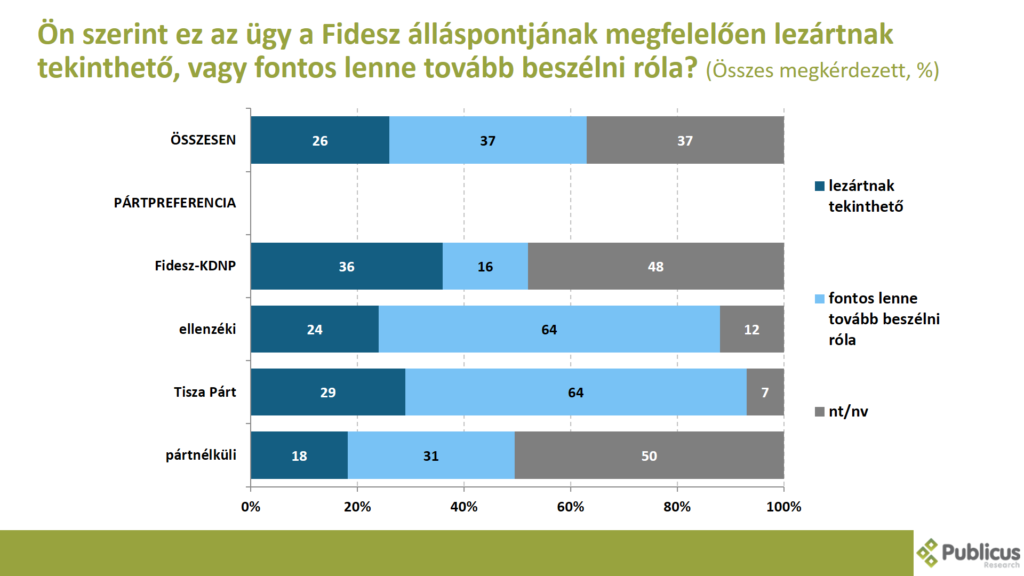 A válaszadók negyede (26 százalék) szerint ez az ügy a Fidesz álláspontjának megfelelően lezártnak tekinthető. Így nyilatkozott a kormánypárti szavazók 36 százaléka, a Tisza Párt szavazóinak a 29 százaléka, az ellenzéki szavazók 24 százaléka, illetve a pártnélküliek 18 százaléka.