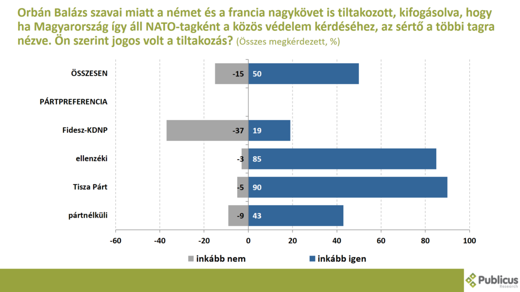Orbán Balázs szavai miatt a német és a francia nagykövet is tiltakozott, kifogásolva, hogy ha Magyarország így áll NATO-tagként a közös védelem kérdéséhez, az sértő a többi tagra nézve. Minden második (50 százalék) válaszadó szerint jogos volt a nagykövetek tiltakozása. Így gondolja a Tisza Párt szavazói közül tízből kilenc (90 százalék), az ellenzéki szavazók túlnyomó többsége (85 százalék), a pártnélküliek 43 százaléka, illetve a Fidesz szavazók 19 százaléka.