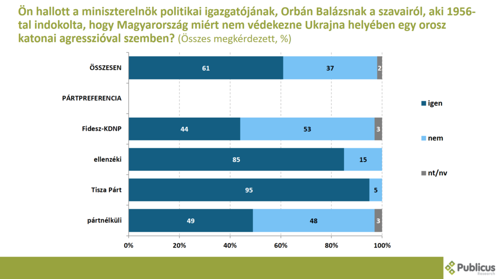 Tízből hat (61 százalék) válaszadó hallott a miniszterelnök politikai igazgatójának, Orbán Balázsnak a szavairól, aki 1956-tal indokolta, hogy Magyarország miért nem védekezne Ukrajna helyében egy orosz katonai agresszióval szemben. Így nyilatkozott a Tisza Párt szavazóinak a 95 százaléka, az ellenzéki szavazók 85 százaléka, a pártnélküliek 49 százaléka, illetve a Fidesz szavazók 44 százaléka.
