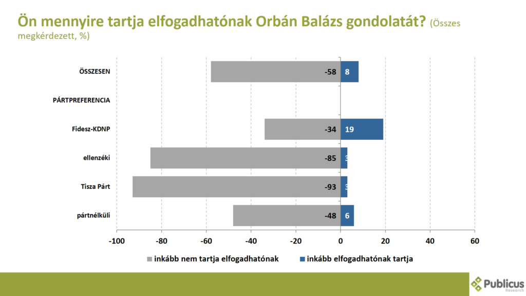 Tízből hat (58 százalék) megkérdezett inkább nem tartja elfogadhatónak Orbán Balázs gondolatait. Ezt mondta a Tisza Párt szavazóinak a 93 százaléka, az ellenzéki szavazók 85 százaléka, a pártnélküliek 48 százaléka, illetve a Fidesz szavazók 34 százaléka. (A kormánypárti szavazóknak csak a 19 százaléka tartja inkább elfogadhatónak a miniszterelnök politikai igazgatójának szavait).