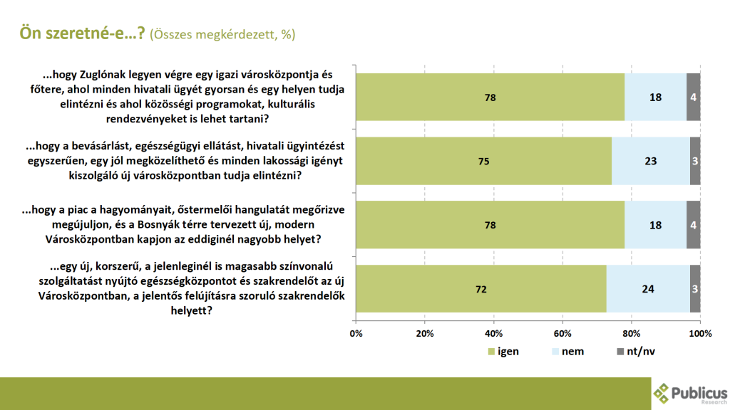 A zuglóiak több mint háromnegyede (78 százalék) szeretné, hogy Zuglónak legyen végre egy igazi városközpontja és főtere, ahol minden hivatali ügyét gyorsan és egy helyen tudja elintézni és ahol közösségi programokat, kulturális rendezvényeket is lehet tartani.