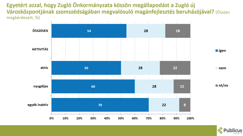 A megkérdezettek többsége (54 százalék) egyetért azzal, hogy Zugló Önkormányzata kössön megállapodást a Zugló új Városközpontjának szomszédságában megvalósuló magánfejlesztés beruházójával.