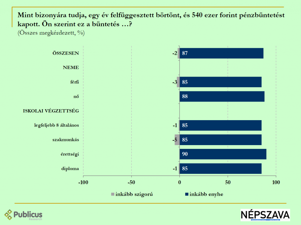 Tízből három megkérdezett a jogszabályokat, tízből szintén három az ügyészséget, a válaszadók negyede pedig a bíróságot, a bírói gyakorlatot teszi elsősorban felelőssé azért, hogy Kaleta Gábor túlságosan enyhe büntetést kapott.