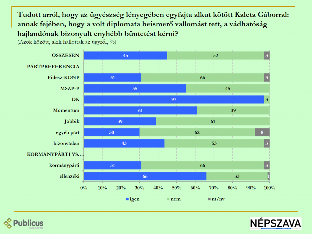 A megkérdezettek közel fele (45 százalék) tudott arról, hogy az ügyészség lényegében egyfajta alkut kötött Kaleta Gáborral: annak fejében, hogy a volt diplomata beismerő vallomást tett, a vádhatóság hajlandónak bizonyult enyhébb büntetést kérni.